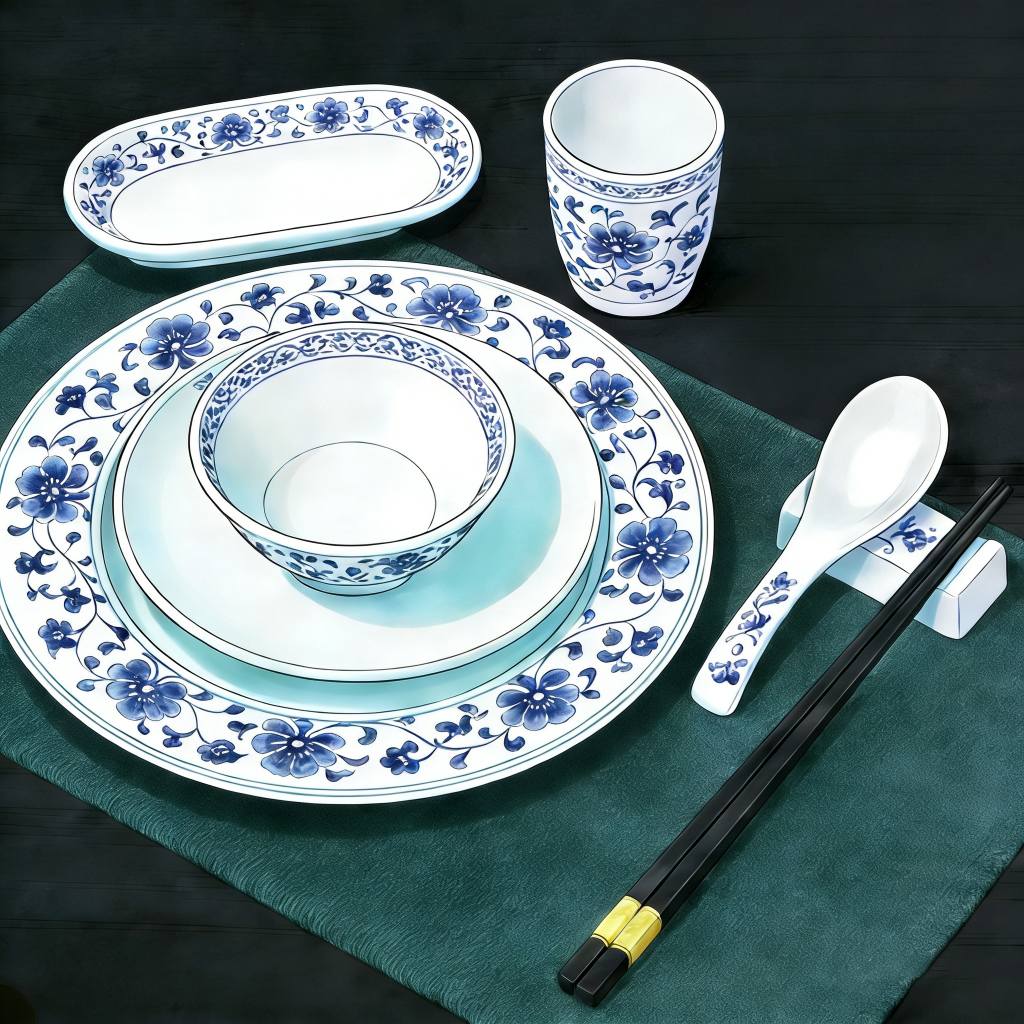 Cuando se trata de vajillas, los utensilios chinos comunes incluyen tazas, platos, tazones, platos, palillos y cucharas, todos generalmente dispuestos frente a cada comensal. Entre las convenciones, "golpear los tazones con los palillos" es un tabú notable. Esto se debe a la práctica de los antiguos mendigos que golpeaban sus cuencos para llamar la atención mientras mendigaban, lo que hacía que el acto se considerara descortés en la mesa del comedor.