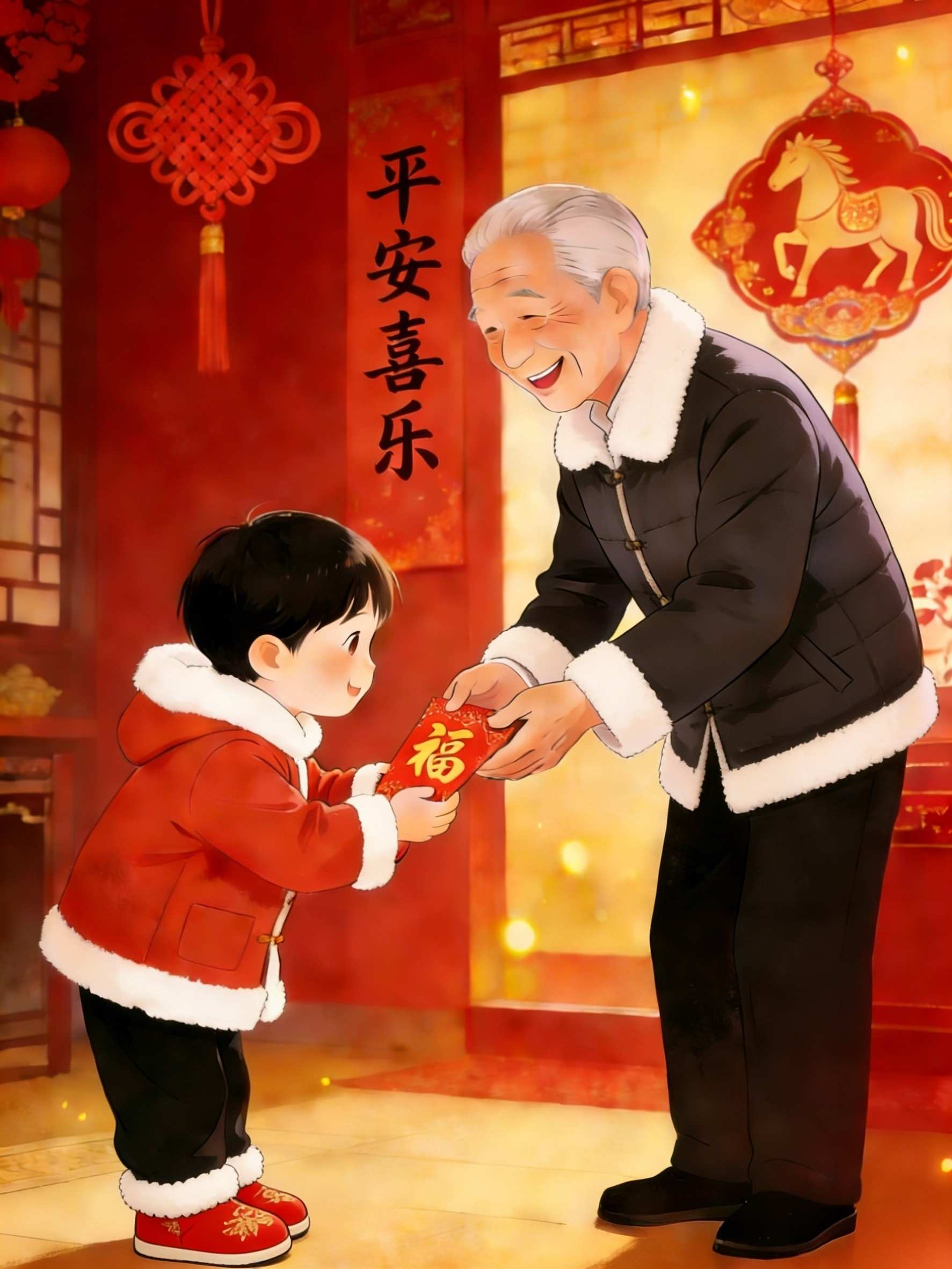 Durante el período de Año Nuevo, la gente visita a sus familiares y amigos con amables palabras y bendiciones. Se dicen "Feliz Año Nuevo" y les desean a todos salud y felicidad. Los mayores entregarán sobres rojos con dinero a los niños, a los más pequeños, expresando amorosas esperanzas por su crecimiento y bienestar.