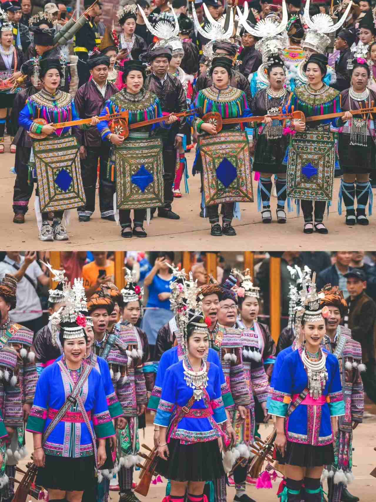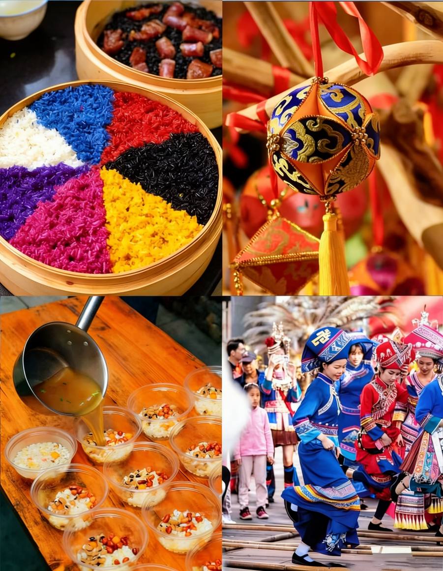 Además de cantar, la gente celebra preparando arroz glutinoso de cinco colores teñido con jugos de plantas, lanzando bolas bordadas, bailando danzas con cañas de bambú y tocando tambores de bronce.
